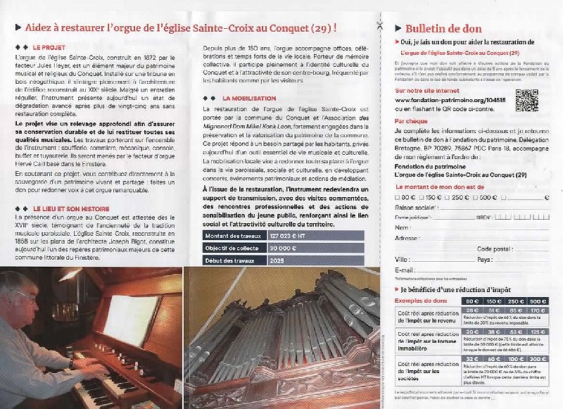 "Die Kirche Sainte-Croix erhielt ihre Orgeln bei ihrer Errichtung im Jahr 1872 auf Wunsch des damaligen Bürgermeisters François TISSIER, der sie aus eigenen Mitteln spendete. Sie wurde von dem Orgelbauer Jules HEYER aus Quimper gebaut und ist eine der 23 schönsten denkmalgeschützten Orgeln im Département Finistère.